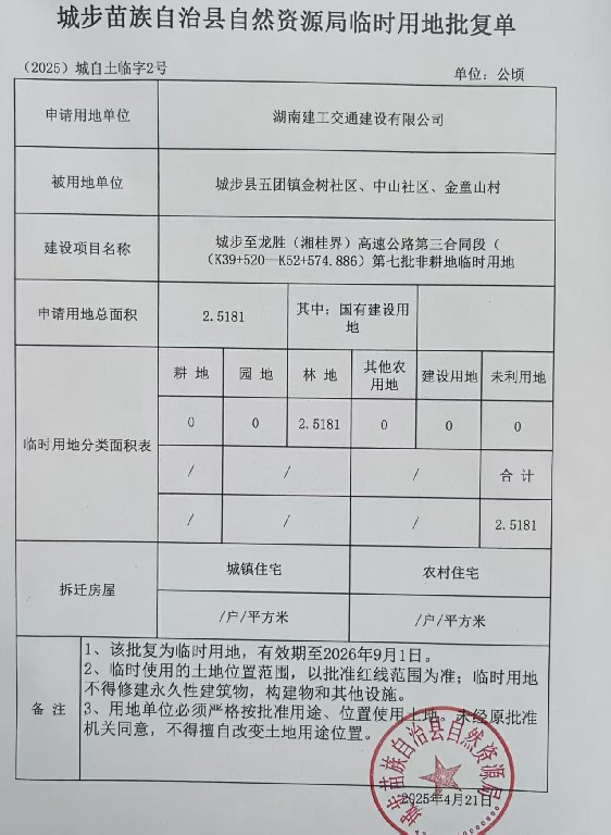 城步至龙胜(湘桂界)高速公路第三合同段(k39+520-k52+574.886)第七批非耕地临时用地审批单 (2025)城自土临字2号