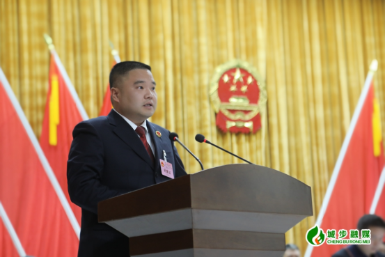 图为县人民法院院长李俊刚作县人民法院工作报告