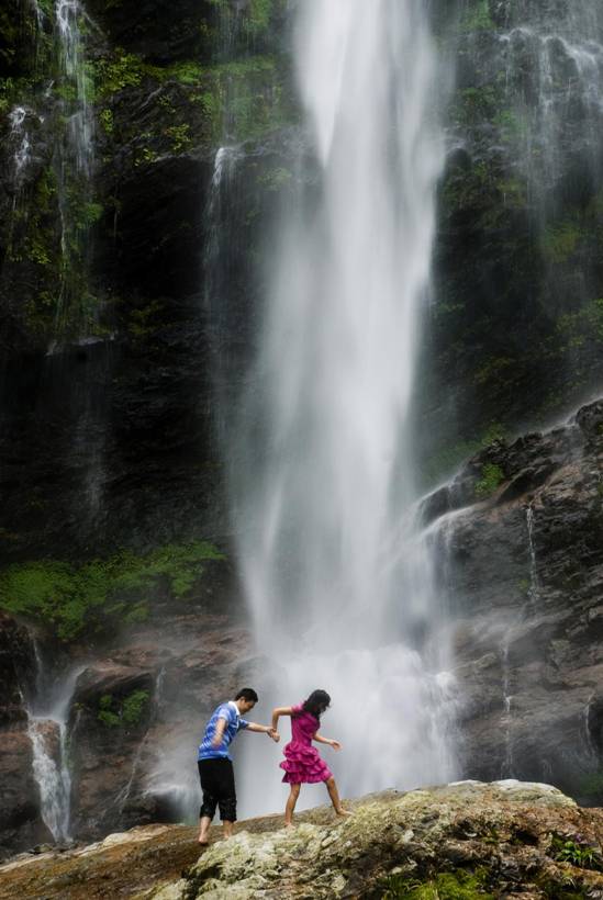 玉女溪景区最为壮观的当数玉女瀑布,它从60多米高的悬崖顶部腾空飞来,倾泄而下,洒珠溅玉,水雾如烟,气势磅礴,从上至下形成了一幅巨大的白色水帘,日久积深,底部形成一泓宽约30m2的清潭,潭面的水雾犹如千万条绽开的雪莲,在阳光的折射下常会出现绚丽的彩虹(如果大家在此耐心等等的话就一定会碰上这难得一见的奇观哦)。你们瞧,那浓情相伴的两棵树,能猜到有多大年纪了吗?别看它们还小,据这周围的老人讲,从来就是这么大,一年四季,常青如此,婀娜相依,宛如一对深情相守的金童玉女,给这一方净土平添了几多灵气和娇媚。大家听,水落潭底的声音不正是金童玉女大声宣讲爱的宣言吗。