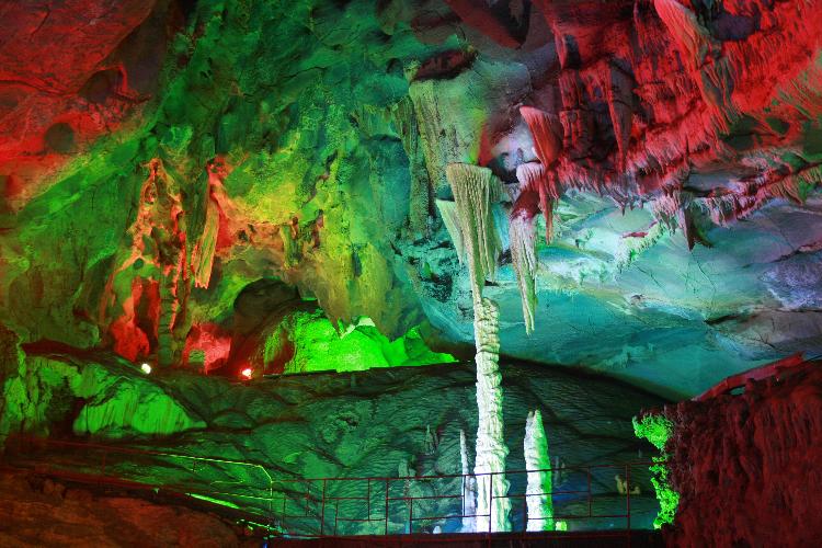 石奇,洞中怪石罗列,奇岩相叠,一石多色,五彩缤纷;石笋、石凳、石人点缀其间,或横或竖,光怪陆离。