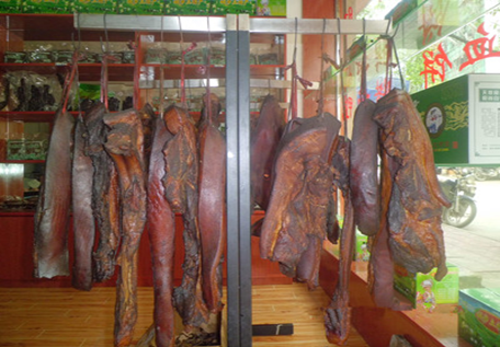 城步腊肉源自野菜苞谷喂大的土猪,经过盐的浸透和柴火慢慢熏烤而成。烘腊肉,急不得,没有数月时间,肉里水气不会干,香气也就出不来。炕上腊肉,漆黑如锅底,有“黑武器”之称。然经洗净,它的精美质地就会呈现出来,肥肉透亮,精肉深红,吃起来精肉贼香,肥肉油滋滋却不腻。除腊肉外,还有畜肉、鱼、泥鳅、黄泥蛙等腊菜。