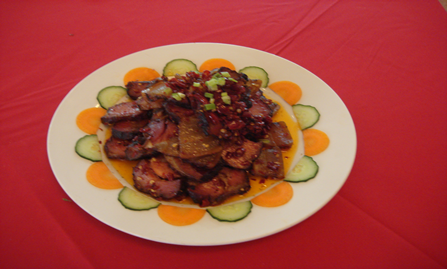 每逢婚娶喜庆,筵席上都少不了一大碗香气四溢的“八宝饭”。它是用糯米、猪油、红枣、莲子、苡米、绿豆、芝麻等八种原料制成,因而谓之“八宝”。相传“八宝饭”是古时向皇帝进贡的佳品。有人赞道:“世上美味‘八宝饭’,惹得香气扑鼻来,闻着八宝神采弈,可称佳品盖世间。”