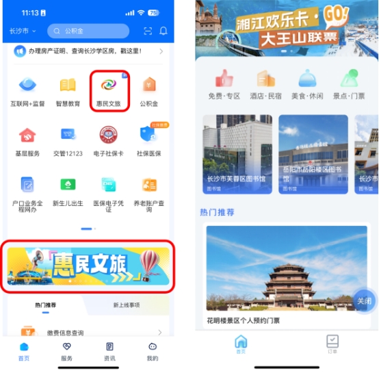 登陆“湘易办”后,在首页搜索服务名称,或在金刚区及banner处点击“惠民文旅”,便可进入服务。