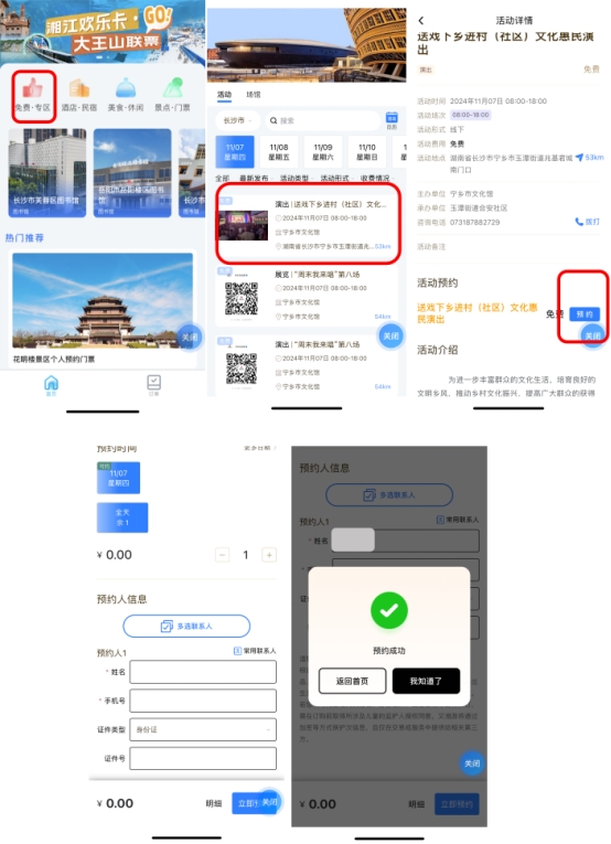选择 “免费・专区” ,进入后可查询并预约各类免费的活动以及场馆。
