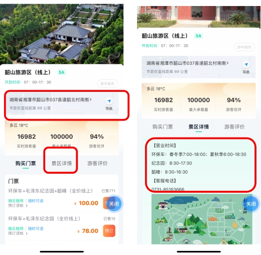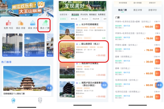 选择 “景点・门票” ,进入后可查询并购买景区门票。还可查询景区距离以及景区详情。