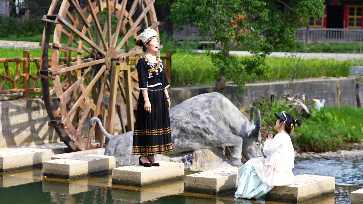 年轻的山歌传承者阳华英(左)为采风达人(右)献唱山歌(陈科帆 供图)