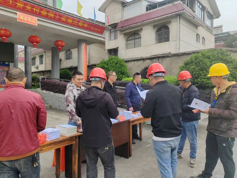 “支付条例我有空就会看,有空就会和工友们一起学习,如果碰到欠薪事情,我们心理就有底了”。5月8日,城步劳动保障监察大队在城北大道一施工场地现场开展保障农民工工资支付条例实施三周年宣传活动,向工地工友发放并讲解《保障农民工工资支付条例》等宣传资料,农民工刘某杰高兴地对记者说。